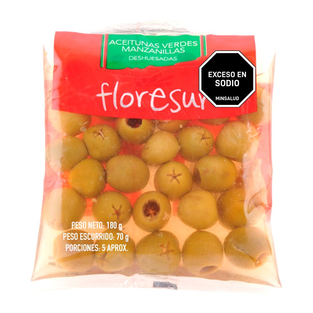 Aceitunas verdes manzanillas deshuesadas. Marca: Floresur. Características: aceitunas verdes manzanillas deshuesadas. Almacenamiento: Consérvese bien cerrado en un lugar limpio, fresco y seco, después de abierto consúmase en el menor tiempo posible.
