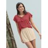 Camiseta manga corta con boleros. Su silueta es semiajustada para darte comodidad y frescura. En el cuello cuenta con detalle de borlas con tiras anudables, para un look más romántico.