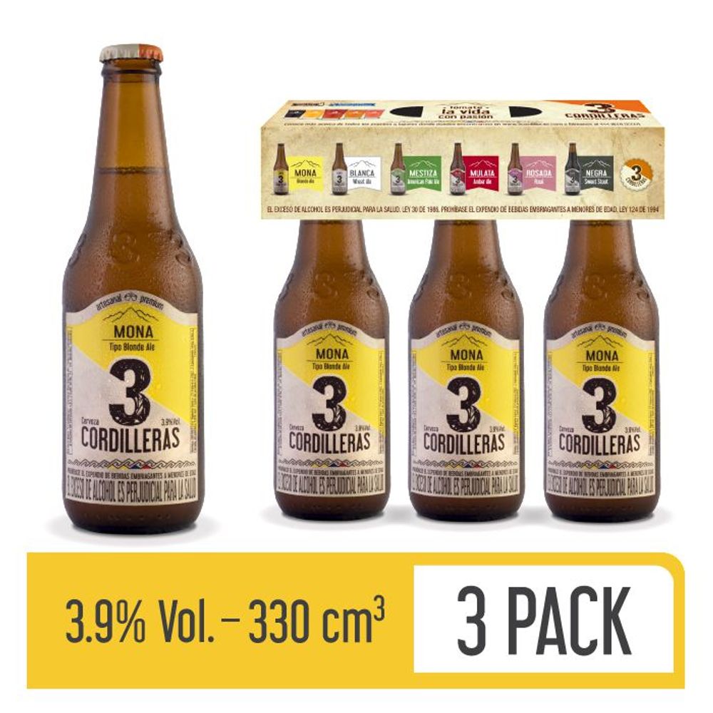 La 3 Cordilleras Mona es una deliciosa cerveza artesanal tipo Blonde Ale elaborada con cuatro ingredientes: 100 % Malta, 100 % lu?pulo en pellets, agua y levadura.