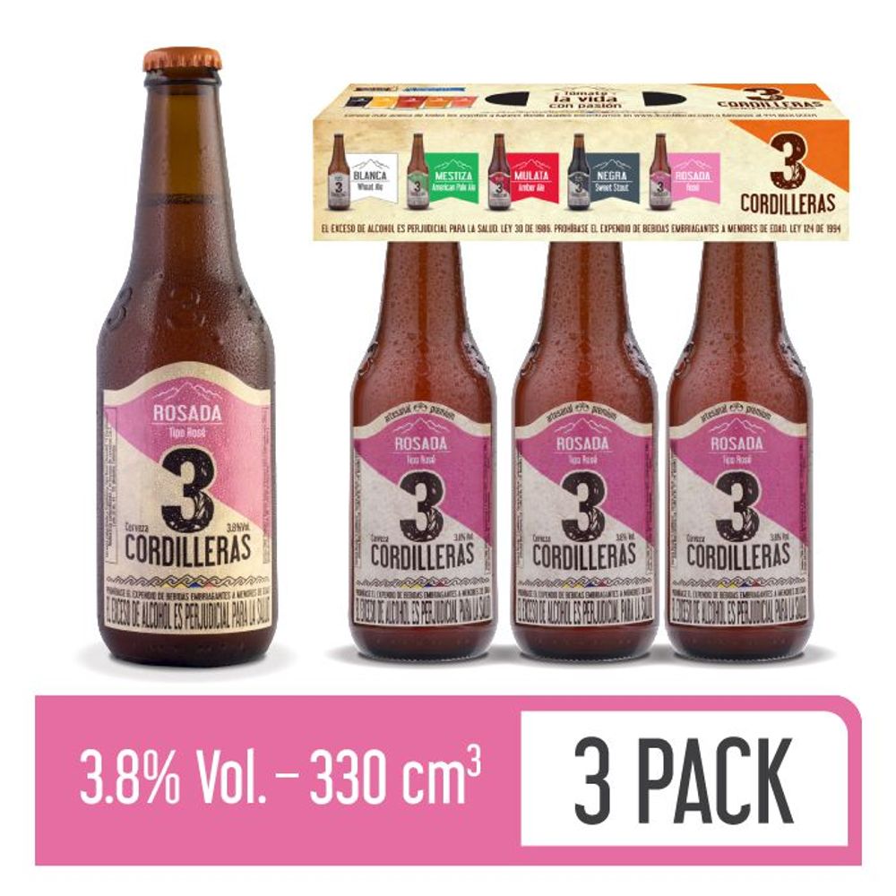 La 3 Cordilleras Rosada es una deliciosa cerveza artesanal tipo Rosé elaborada con los siguientes ingredientes: 100 % Malta, 100 % lu?pulo en pellets, agua, levadura y extractos frutales naturales.