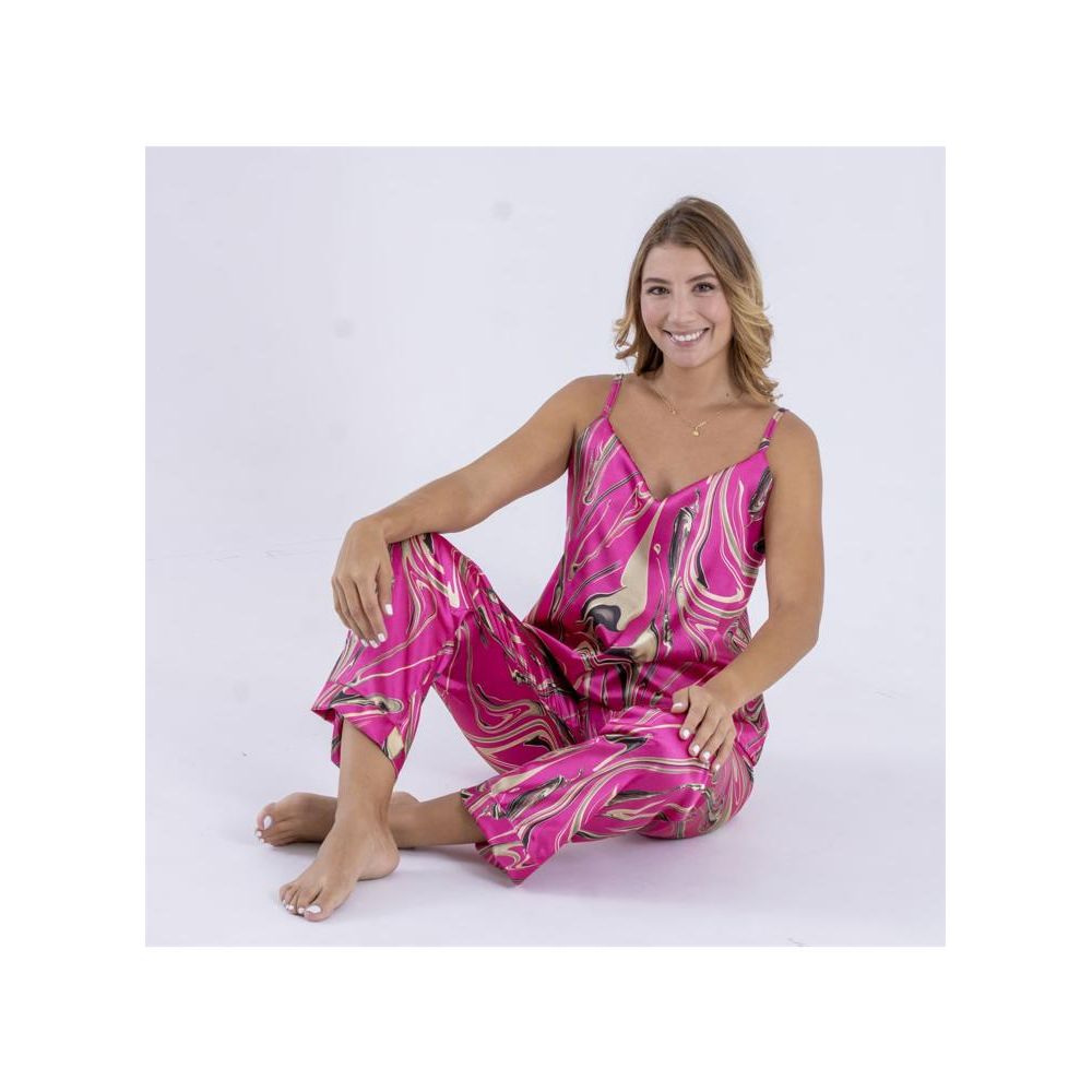 Pijama en Satín para mujer, pantalón largo, tela suave y elegante, con tiras ajustables para mayor comodidad y adaptabilidad.