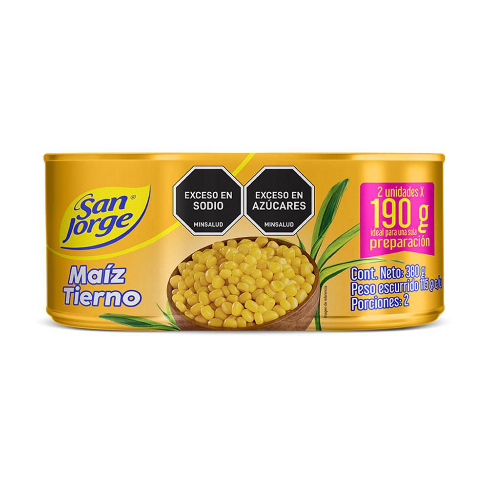 Maíz tierno. Marca: San Jorge. Características: Maíz tierno x 2und. Contenido neto: 190g x c/u. Almacenamiento: Consérvese en un lugar limpio y fresco, después de abierto consumir en el menor tiempo posible.