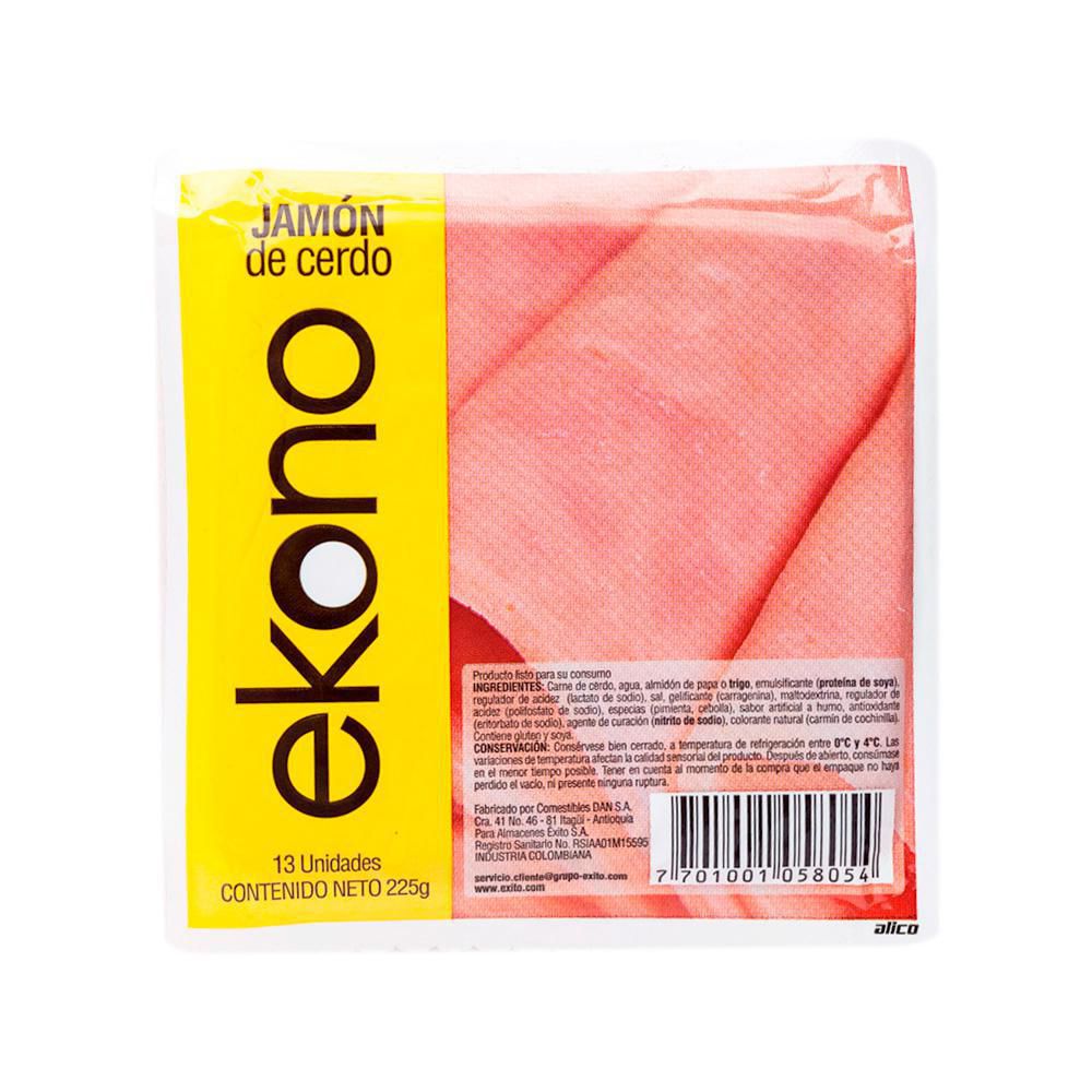 Jamón de cerdo Ekono. Contiene 13 unidades. Mantener refrigerado,una vez abierto consúmase en el menor tiempo posible.