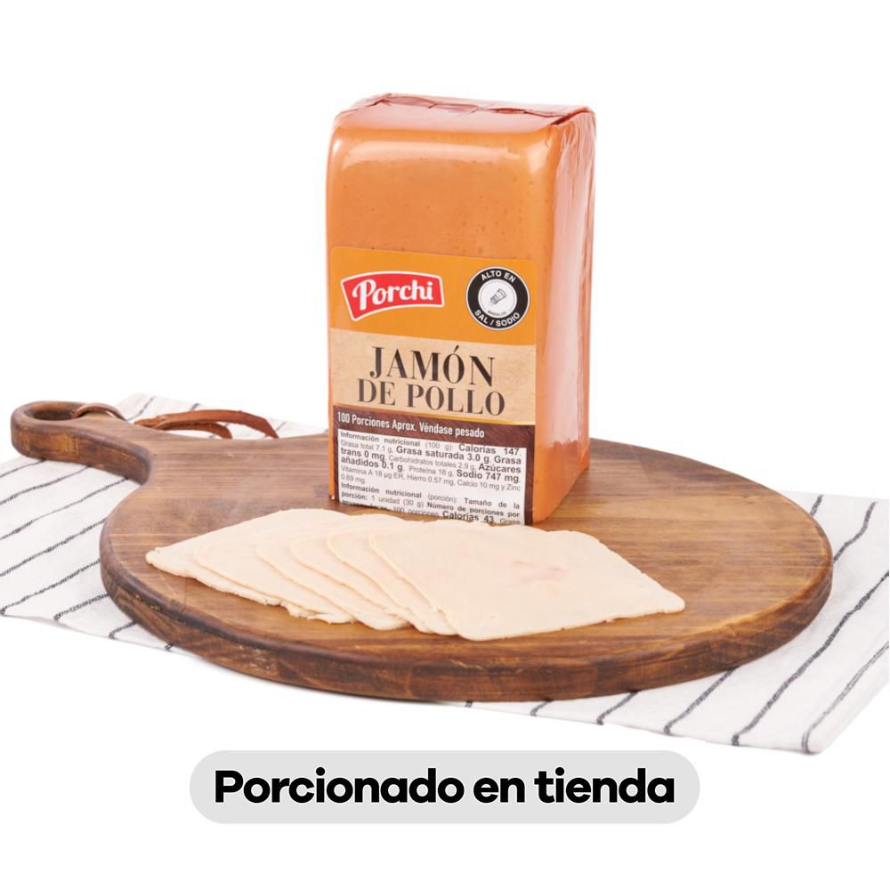 Jamón De Pollo Premium X 1000g. Marca: Porchi. Características: 99% libre de grasa. Producto listo para el consumo. Almacenamiento: consérvese refrigerado entre 0°C y 4°C. Después de abierto retire su contenido y consúmase en el menor tiempo posible.