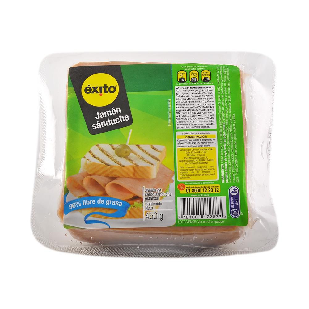 Jamón Sanduche Éxito 96% Libre de Grasa x 450g. Marca: Éxito. Características: Jamón sanduche Éxito 96% libre de grasa estándar. Almacenamiento: Consérvese en un lugar limpio y seco, después de abierto consúmase en el menor tiempo posible. Refrigerar.
