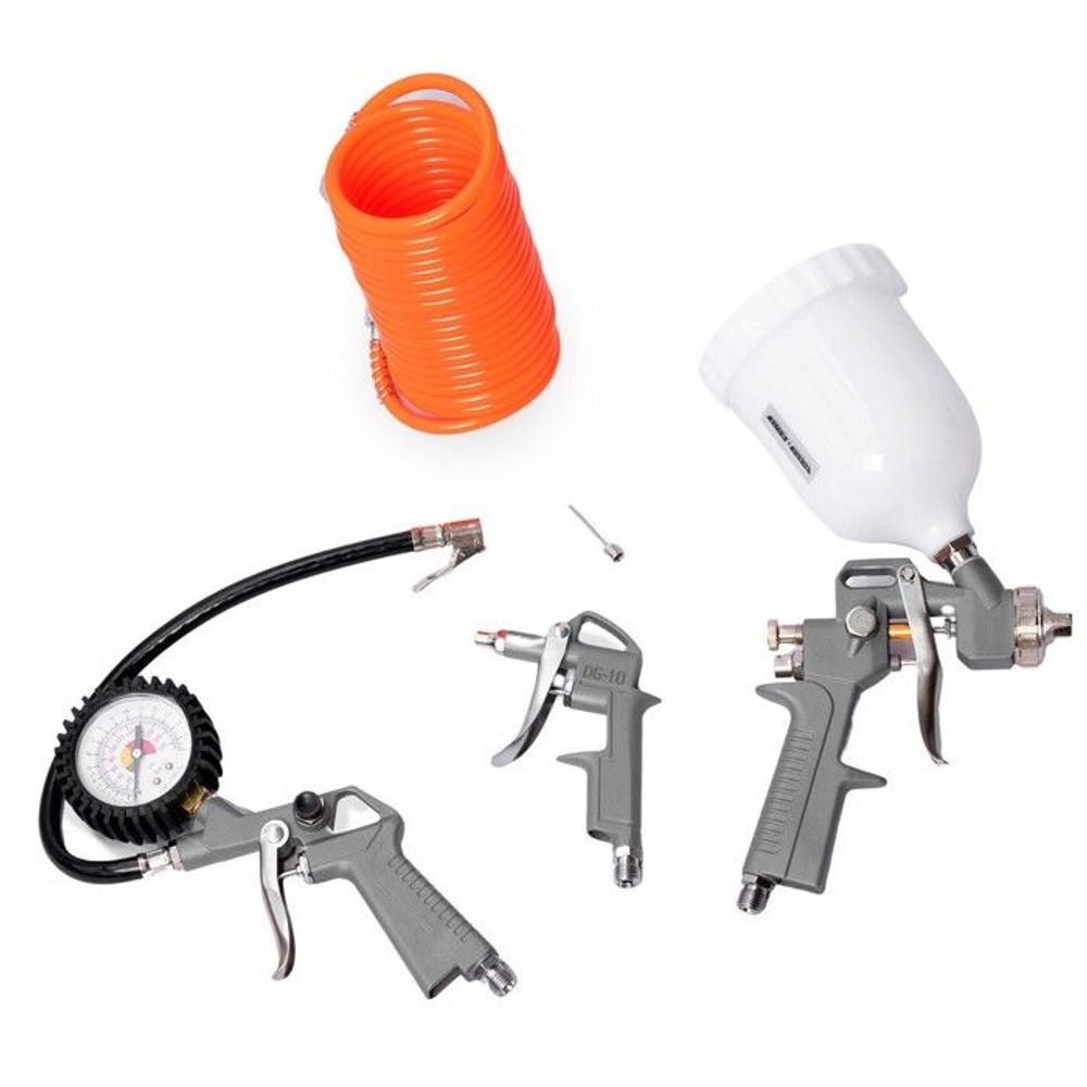 Kit de accesorios para compresor de aire 5 piezas. Aguja para inflar balones, pistola de pintar, Inflador de llantas con manómetro, pistola de limpieza y soplado, manguera de aire. Garantía de un año por defectos de fabrica. Alto 20cm, Ancho 26cm, largo 10cm, peso 1 kg