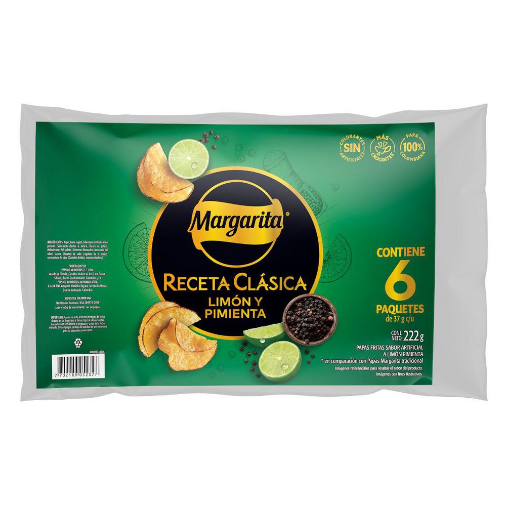 Papas Fritas Lima y Pimienta Bolsa x 6 paq. Marca: Margarita. Caracter?sticas: con la mejor receta cl?sica de las papas fritas Margarita con lima y pimienta negra. Almacenamiento: Cons?rvese bien cerrado en un lugar limpio, fresco y seco dentro del empaque, alejado de la luz directa del sol o de cualquier otra fuente de calor, despu?s de abierto consumase en el menor tiempo posible.