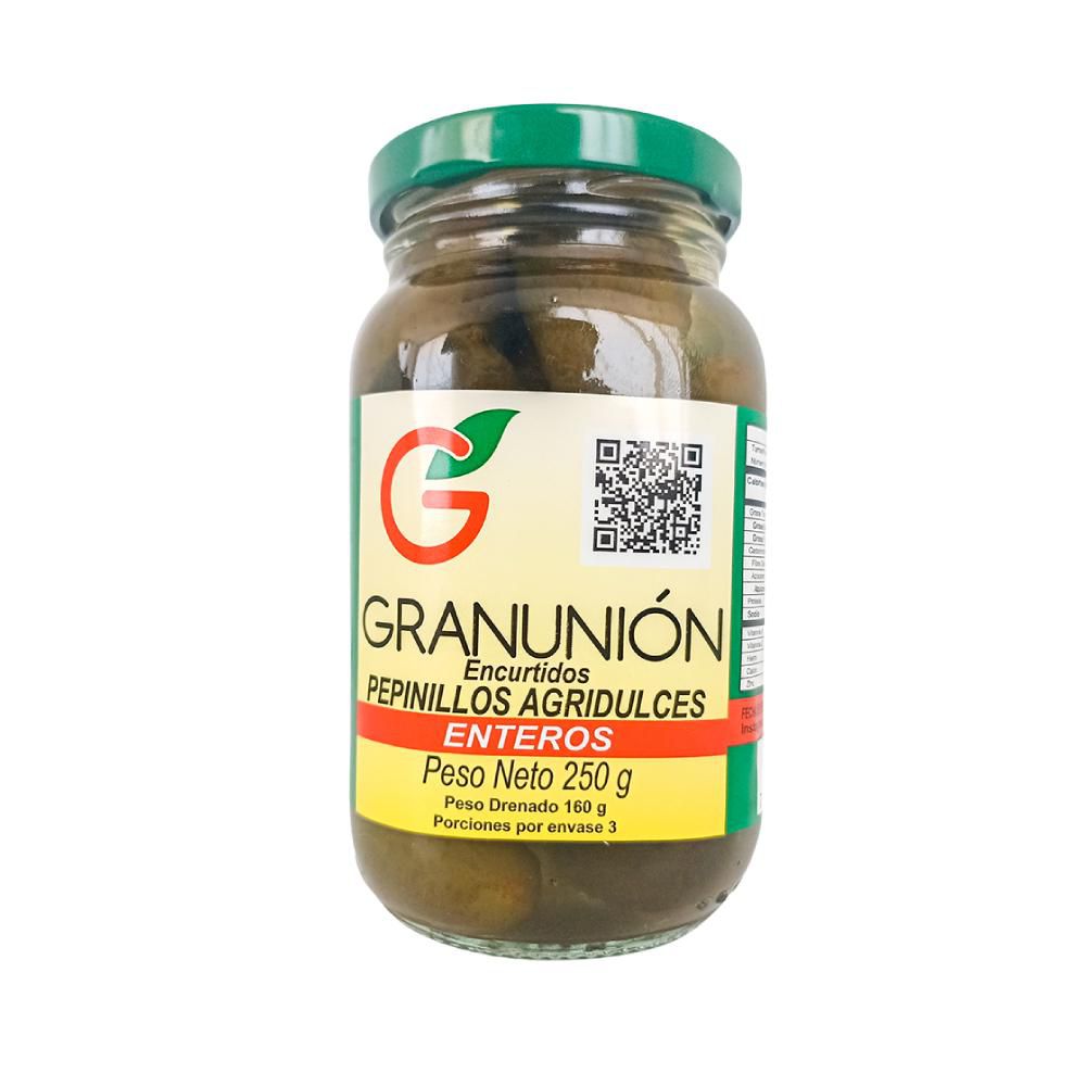 Pepinillos agridulces enteros. Marca: Granunión. Características: Este producto se conserva al medio ambiente. Almacenamiento: Consérvese en un lugar limpio y fresco, después de abierto consumir en el menor tiempo posible.