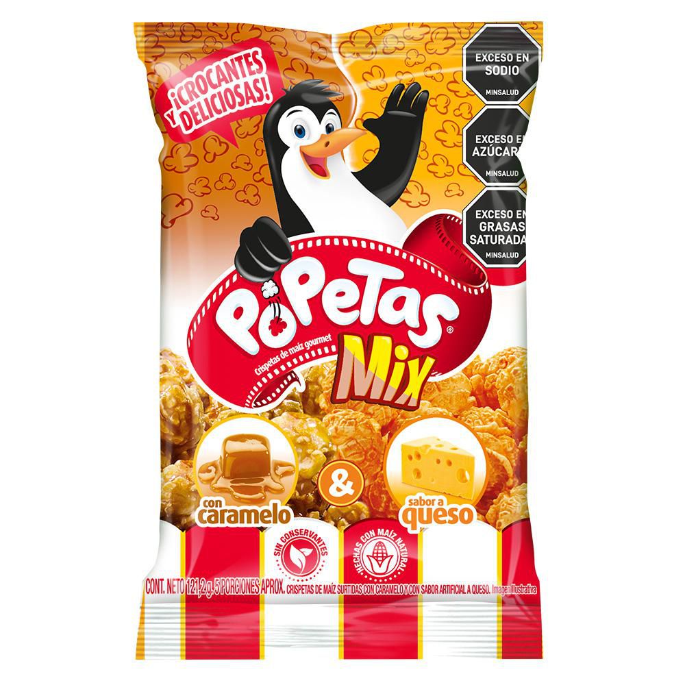 | Ingredientes | Crispetas de maíz con caramelo: Ingredientes: Caramelo (azúcar, glucosa, grasa vegetal (aceites y grasas de palma y sus fracciones, lecitina de soya), sal, sabor artificial, emulsificante (lecitina de soya), colorante caramelo), maíz pira, mezcla de aceites vegetales (palma, soya y girasol), emulsificante (lecitina de soya).Crispetas de maíz sabor a queso: Ingredientes: maíz pira, mezcla de aceites vegetales (palma, soya y girasol), sabores artificiales, sal, sabor idéntico al natural, colorante natural (bixina). |