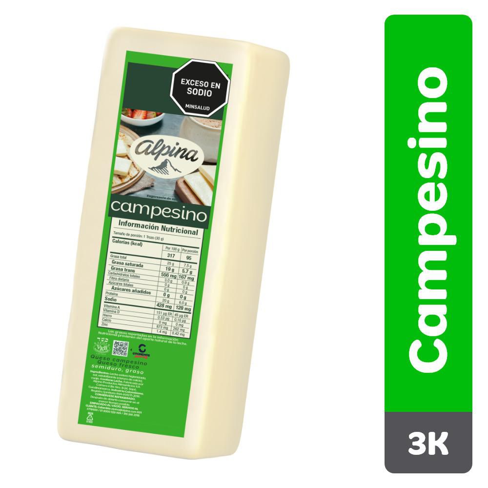 Queso Campesino. Marca: Alpina. Características: Queso naturalmente libre de grasa trans, buena fuente de calcio, bajo en sodio, queso fresco, semiduro y graso. Almacenamiento: Después de abrir consérvese refrigerada, consúmalo en el menor tiempo posible.