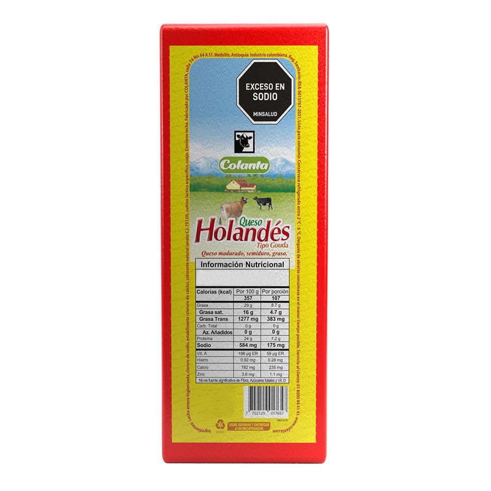 Queso holandés Colanta. Queso semimaduro. CONSERVACIÓN: Consérvese en un lugar fresco. Una vez abierto consuma en el menor tiempo posible.