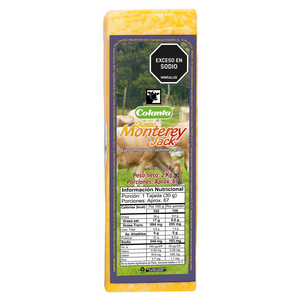 Queso Monterey Jack x Kg. Marca: Colanta. Características: Queso madurado, semiduro y graso en bloque. Almacenamiento: Consérvese refrigerada, después de abrir consúmalo en el menor tiempo posible.