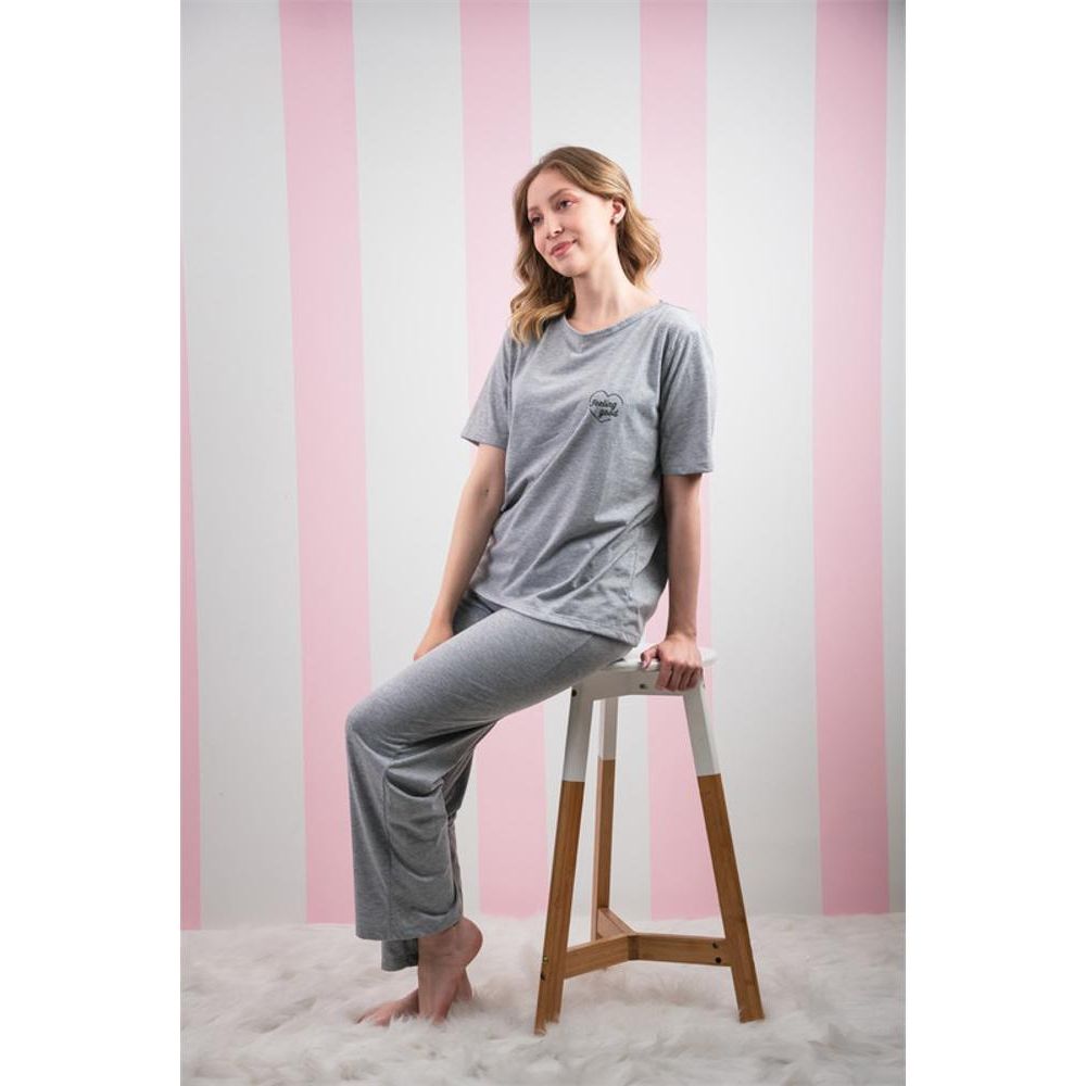 Pijama 100% algodón de dos piezas. FIT: Oversized CAMISETA: Cuello redondo, manga corta. Tela: Algodón, Color: Gris. PANTALÓN: Pantalón largo, bota recta. Color: Gris Tela: Algodón.