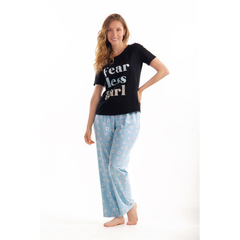 Pijama de dos piezas. CAMISETA: Cuello redondo, manga corta. Tela: Franela, Color: Negro. PANTALÓN: Pantalón largo, bota recta, pretina con cordón ajustable. Color: Azul estampado. Tela: Piel de Durazno.