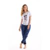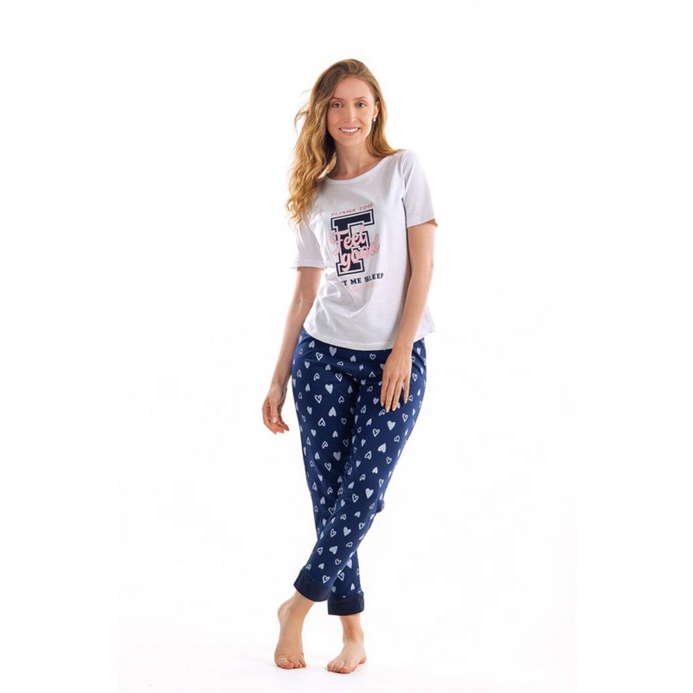 Pijama de dos piezas. CAMISETA: Cuello redondo, manga corta. Tela: Algodón, Color: Blanco. PANTALÓN: Pantalón largo, bota entubada, pretina con cordón ajustable. Color: Azul estampado. Tela: Franela.