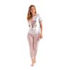 Pijama de dos piezas. CAMISETA: Cuello redondo, manga corta. Tela: Algodón, Color: Blanco. PANTALÓN: Pantalón largo, bota entubada, pretina con cordón ajustable. Color: Rosa estampado. Tela: Franela.