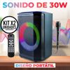 Especificaciones: - Potencia: 30W. - Tamaño del parlante: 8 pulgadas. - Medidas: Alto 36 cm, Ancho 25 cm, Largo 29 cm. - Conectividad: Bluetooth, Radio FM, Entrada USB, Entrada para micrófono. - Batería recargable para horas de uso continuo. - Color: Negro con luces LED RGB.
