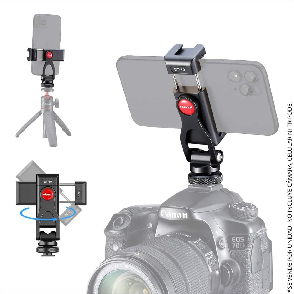 Diseño con 2 zapatas frías estándar y entrada de tornillo de 1/4': Soporte de trípode para smartphone mejorado con un orificio de tornillo estándar de 1/4'en la parte inferior y zapata con bloqueo. Además en la parte superior tiene dos entradas de zapatas frías.