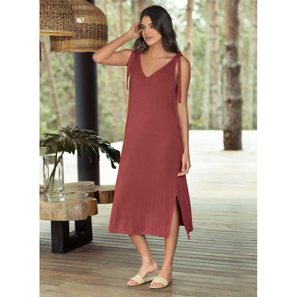 Este vestido midi con escote en V y anudado en el hombro, cuenta con un detalle que te da versatilidad para usarlo en casa como pijama o como prenda exterior. Es muy liviano y fresco ideal para los climas más cálidos. Su silueta es semiajustada y tiene aberturas laterales en la parte inferior que te harán lucir más chic.