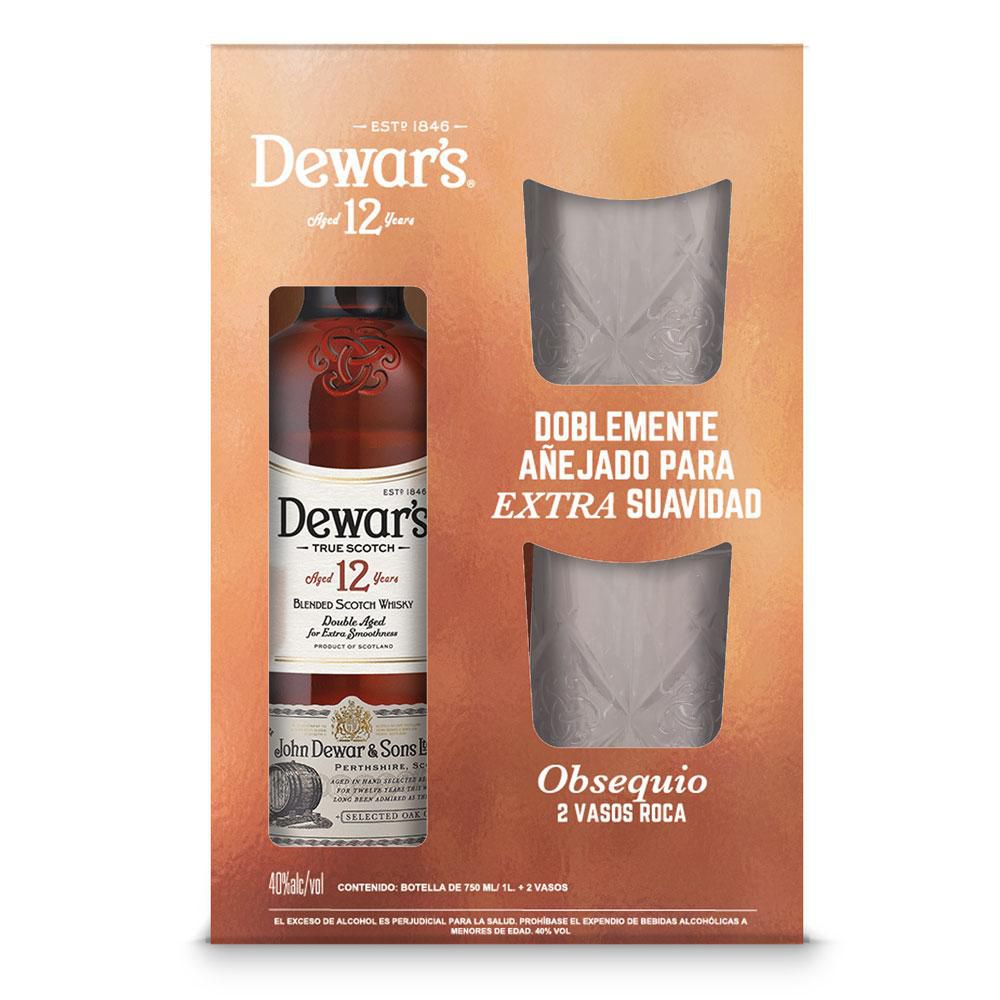 Whisky DEWARS doblemente añejado + 2 vasos regalo (750 ml)