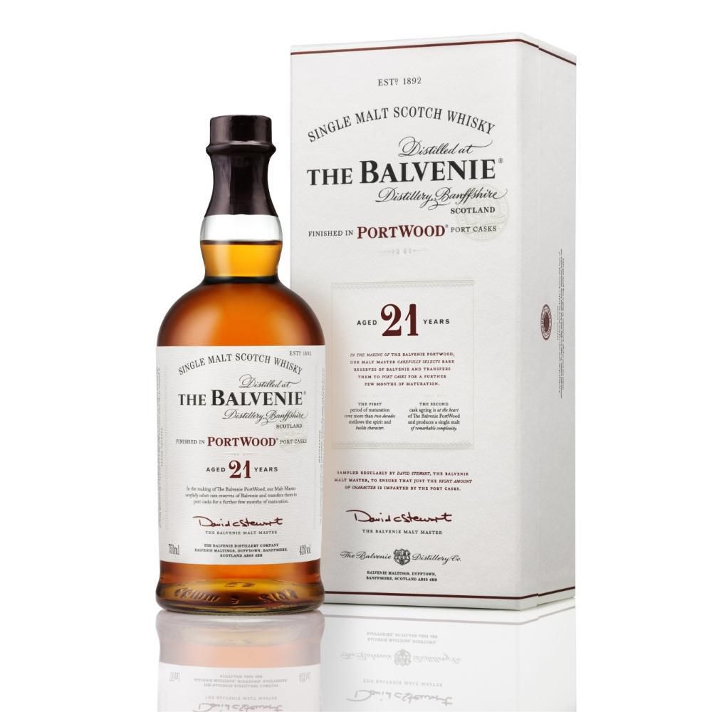 The Balvenie Portwood single malt scotch 21 años. Previamente madurado por 21 años en barriles americanos ex Bourbon para una maduración extendida en exquisitos barriles de oporto, o pipas, que han contenido vinos de oporto finos. El whisky es regularmente vigilado por el Malt Master de The Balvenie ,David C. Stewart , para garantizar que los barriles de oporto impartan la cantidad justa de carácter, mejorando y desarrollando un whisky único.